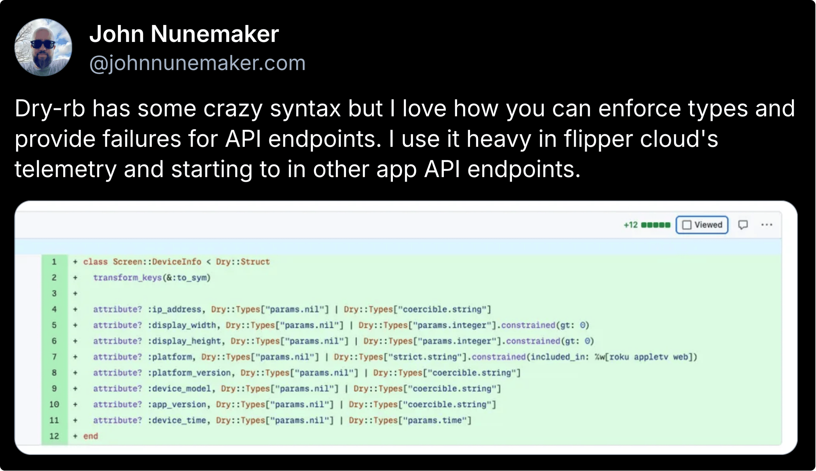 π» John Nunemaker shared how you can enforce types and provide failures for API endpoints via Dry-rb