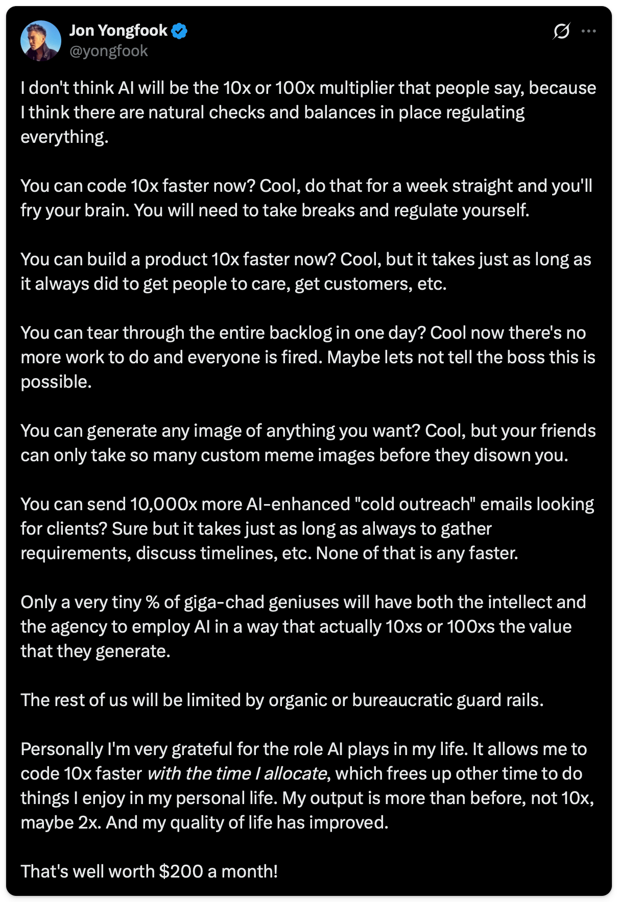π€ Jon Yongfook shared about AI impact on developers productivity: