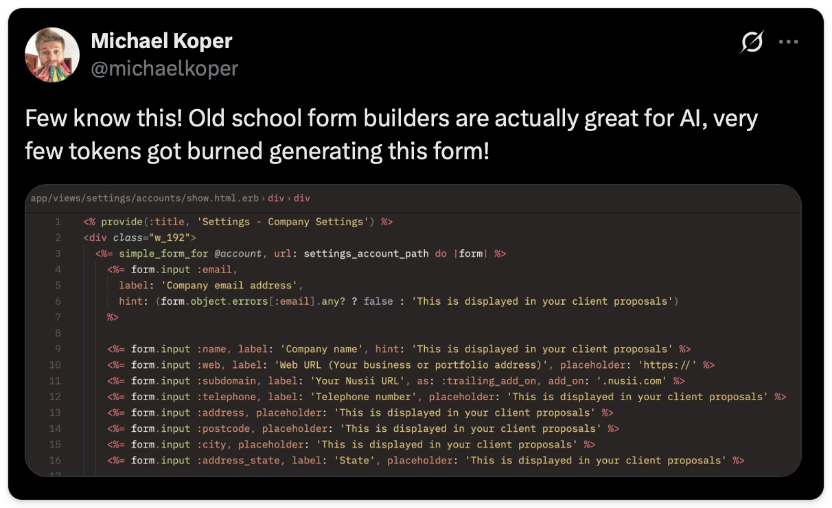 οΈπ» Michael Koper shared a code sample about how form builders are great for AI: