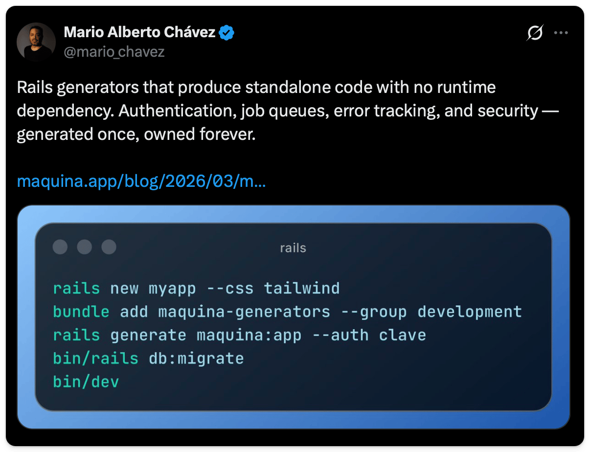 οΈπ Mario Alberto ChΓ‘vez shared about their project called Maquina Generators: From rails new to Production-Ready