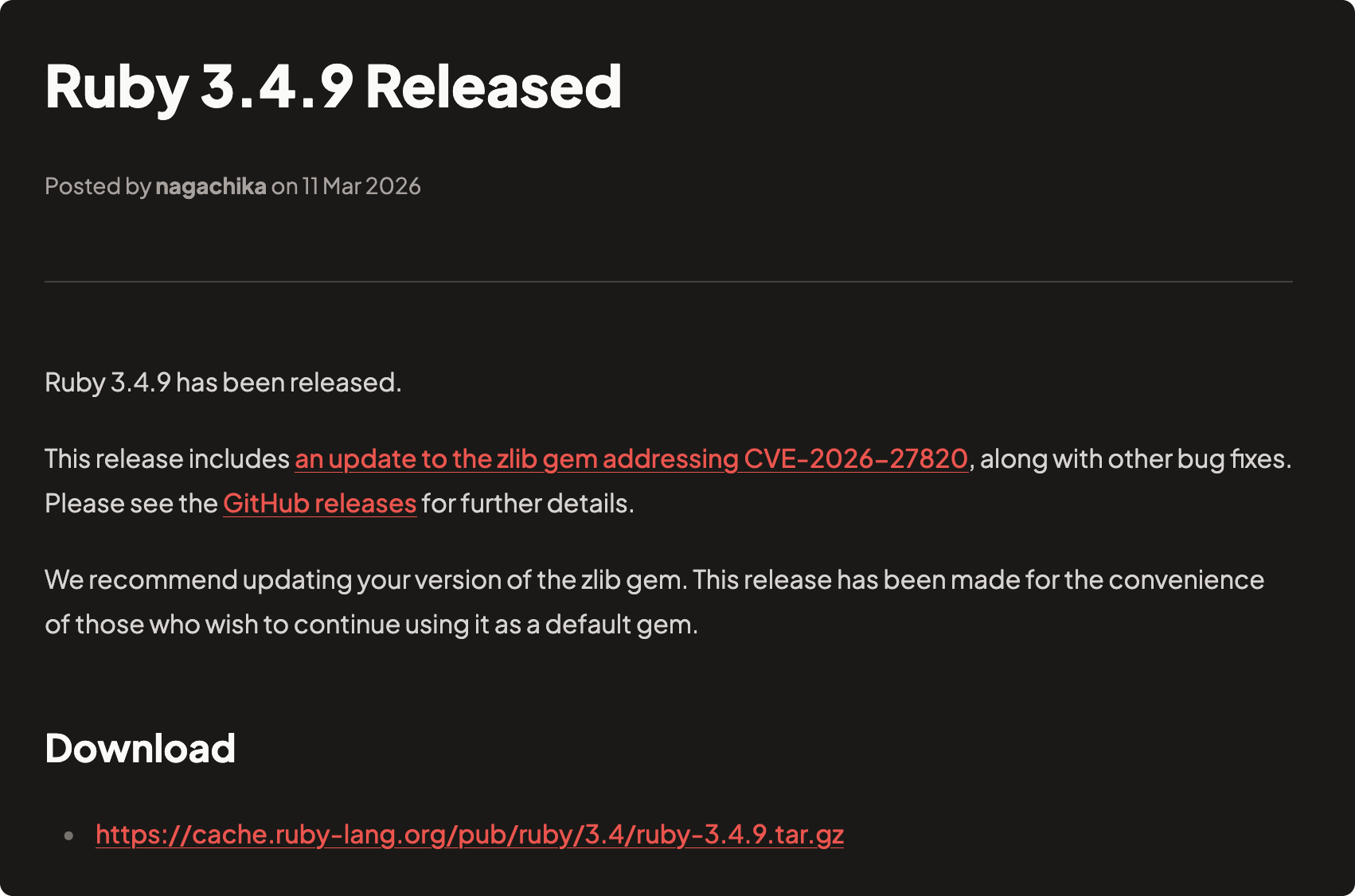 π Nagachika announced the release of Ruby 3.4.9